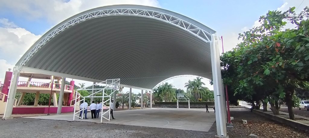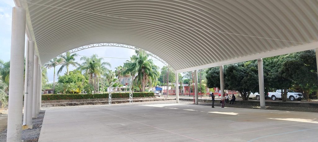 Realicé una supervisión en la comunidad de Tecolapan, donde revisé el avance de la segunda etapa de construcción en la cancha de usos múltiples, la cual ya cuenta con techado de domo. Este espacio, edificado previamente, está siendo fortalecido para ofrecer mejores condiciones a sus usuarios.